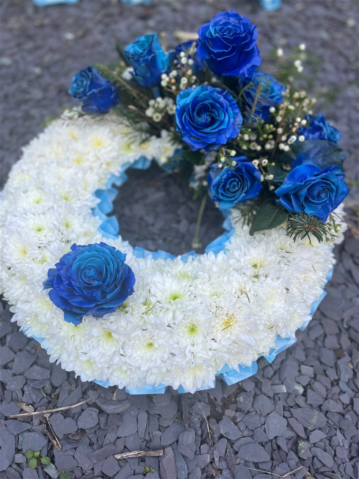 Traditional Wreath based in white chrysanthemums with a floral spray in colours of your choice.